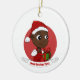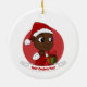 Ornement de Noël avec l'illustration d'un joli sourire joyeux bébé fille ou garçon noir, le bébé porte des vêtements rouges et blancs et tient un cadeau; avec texte modifiable modèle pour votre nom ou message, Noël fêtes design