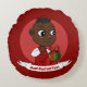 Coussin rond avec l'illustration d'un joli sourire joyeux bébé fille ou garçon noir, le bébé porte des vêtements rouges et blancs et tient un cadeau; avec le texte modifiable modèle pour votre nom ou message, Noël design avec un arrière - plan rouge