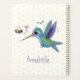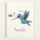 Ce joli design présente un colibri vert et violet heureux avec un ami d'abeilles sur un arrière - plan de pois jaune. Le tout dans un joyeux style d'illustration de dessin animé !