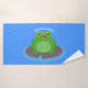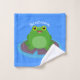 Cette mignonne grenouille verte et joyeuse assise sur un coussin de lys violet est lumineuse et adorable. Beaucoup d'amusement amphibien dessiné dans un joyeux style de dessin animé.