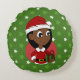 Un oreiller à lancer rond avec l'illustration d'une jolie fille afro-américaine souriante et souriante aux longs cheveux noirs, la fille porte un costume de Santa Clause avec casquette rouge et tenant un cadeau ; dans un cercle rouge sur arrière - plan vert avec motif sans couture aux étoiles vertes et blanches, Pour voir plus de mes personnages de dessin animé, visitez mon magasin