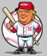 Cette caricature de dessin animé vibrante et exagérée présente l'ancien président américain Donald Trump habillé en joueur de baseball. Il porte un uniforme classique de baseball blanc et rouge avec le numéro "1C" sur la poitrine, ainsi qu'un casquette de baseball rouge avec "TRUMP" écrit dessus. Sa signature de cheveux dorés est visible sous le casquette, et il a un large et confiant sourire. Il tient une batte de baseball dans une main et donne un pouce avec l'autre. L'arrière - plan comprend un grand baseball, renforçant le thème du sport. L'illustration a un ton ludique et humoristique, avec des contours audacieux, des couleurs vives et des proportions exagérées.