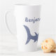 Une grande tasse de latte amusante avec un requin nageant en bande dessinée.