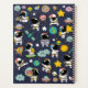 Graphique de clipart astronaute, Espace extra-atmosphérique : astronaute tenant ballon comme une planète, une fusée, étoiles, icône OVNI, icône satellite spatial, planète Saturne, vaisseau spatial, et d'autres. Sur Oxford Blue (bleu marine) arrière - plan.