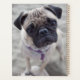 Un carlin fawn avec un visage noir debout sur le genou du photographe regardant dans la caméra.