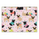 Cute birthday party Pug dogs with black and tan coats dressed in cute birthday outfits with balloons, cake and confeti pattern.