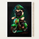 Un ami en fureur derrière les guidons d'une moto verte brillante, portant une tenue verte de la Saint Patrick qui fait tourner la tête. Le chien est habillé d'un ensemble festif, avec une cravate arc-en-ciel verte et un chapeau haut assorti qui se trouve doucement au-dessus de la tête. Le costume présente des motifs complexes de shamrocks et de leprechauns, ce qui indique clairement que ce chien est prêt à célébrer la Saint Patrick avec style.