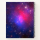 Abell 2744, Pandora's Cluster. Cette grappe de galaxies géantes est le résultat d'une accumulation simultanée d'au moins quatre amas de galaxies séparés et plus petits qui ont eu lieu sur une période de 350 millions d'années. Les galaxies de l'amas représentent moins de 5% de sa masse. Le gaz (environ 20%) est si chaud qu'il ne brille que par rayons X (couleur rouge sur cette image). La distribution de la matière noire invisible (qui représente environ 75% de la masse du cluster) est colorée ici en bleu.