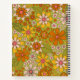 Ce bloc-notes présente un motif rétro à fleurs, inspiré des motifs des années 1960 et 1970, avec des fleurs dans les tons orange, jaune, rose et vert olive sur un arrière - plan vert