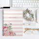 Le carnet floral moderne de pivoine présente des rayures roses chics avec un bouquet de pivoines blush et sauge qui fleurissent du coin. Personnalisez avec un nom, un monogramme ou un message en utilisant le champ fourni.