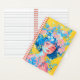 Un carnet avec une fille avec une couronne de fleurs bleues sur la tête. Le personnage est une fille mignonne avec des fleurs sur un fond jaune dans les tons clairs dans le style aquarelle. Un beau souvenir pour étudier ou travailler.