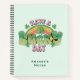Carnet de spirale avec une image sur le thème de la Saint Patrick. Un design de style grunge rétro qui dit : Avoir un jour de chance. Avec un arc en ciel coloré derrière. Mots écrits dans une grosse ambiance arrondie de style rétro. Couleurs rose et verte.