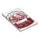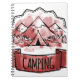 Tente, arbres et ruban "Camping". Badge dessiné à la main avec teinte d'aquarelle rouge