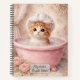 Un adorable chaton assis dans un bain rose rempli de bulles, entouré de roses douces et de détails pastel. Une illustration charmante et douce avec un style vintage cosy.