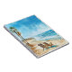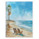 A Watercolor beach scene with chairs and palm trees