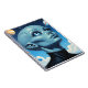 Carnet d'Ufologie. Une belle femme alien extraterrestre étant avec de grands yeux bleus regardant dans l'espace vers les étoiles et les planètes.