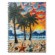 Beach art notebook. An impasto oil painting style ai illustration of a beach full of palm trees, sea glass, sea shells and ocean waves at sunset. A bright colorful mesh of colors make this coastal art vibrant and beautiful!