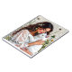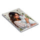 Beautiful whimsical art on a personalized notebook. Wall art with an illustration of a woman holding a white fluffy cat surrounded by dandelions, The picture has a crochet style fabric look.