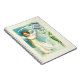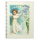 peinture chrétienne vintage en bleu et blanc avec un ange mignon flottant sur un nuage et sonnant une cloche de Noël.