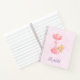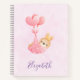Un carnet en spirale personnalisé avec une adorable illustration d'un petit lapin brun portant une petite couronne dorée. Porté par des ballons dans une couverture de coeur rose.