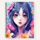 Jolies fleurs violettes et roses et fille anime avec des yeux saisissants carnet féminin.