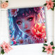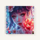 Carnet personnalisé Anime. Une belle fille aux yeux roses, fleurs et notes musicales de l'art glitchcore. Acents floraux violets et roses.