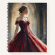 Sumérgete en la opulencia de un cuento de hadas con esta impresionante princesa en un vestido rojo y negro de lujo. La acuarela captura la esencia de la realeza en un palacio majestuoso.