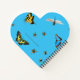 Garden themed, butterflies and bees notebook with custom title. A cute, heart-shaped, spiral bound notebook (size 8 inches) with a pattern of blue and yellow butterflies, bees, and dragonflies. The wonderful beneficial insects cover the front on a bright blue background. A gold colored heart is where your custom text will go. Include a name, or any title. The notebook offers lined, or blank pages. It is perfect for a gardener, or nature lover, of any age.