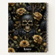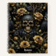 A decorated black and putty-gray skull is nestled among dusty ivory and black flowers. Personalize with your name in a black ribbon. Very Goth and beautiful.