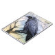 Vitrail, oeuvre abstraite d'un corbeau noir aux grands yeux éffrayants. Le corbeau est perché sur une branche. L'arrière - plan est de couleur crème pâle, avec une pointe de dégradé bleu. Customisez-le avec votre nom ou vos initiales. Copyright Soar In Style Designs LLC.
