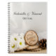 Le Carnet naturel Rustic White Daisies Woodland Mariage Spiral peut être personnalisé pour créer un livre de conseils pour la mariée mariée et mariée ou un livre d'invités pour leur cérémonie de mariage. Ce charmant livre de notes en nuptiale à thème forestier ou en bois de plein air est une photo de la nature d'un bouquet de fleurs marguerites blanches, tranche de bois avec le mot LOVE brûlé dessus, cône de pin brun et voile de mariée blanc avec un burlap et arrière - plan satin blanc.