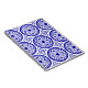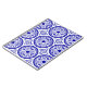 Un motif original en faux carreaux d'inspiration delft en bleu et blanc avec des rouleaux ornés.sur les bords et un centre avec un motif gothique de croix et de feuilles.