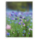 Un champ de fleurs de maïs dans les tons bleu profond et pâle, violet, lavande et rose, avec des feuilles vert pâle.