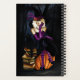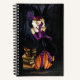 Une sorcière blonde assise sur un grand citrouille orange. De son côté, un chat noir sur une pile de livres. Derrière se trouve une forêt et un château