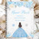Ce livre d'hôtes élégant et glamour présente une belle princesse aux cheveux foncés et à la peau foncée en robe bleue. Le texte combine écriture manuscrite et polices sans serif modernes pour un look élégant et sophistiqué. Les compositions florales, les flocons de neige et les confettis argentés créent un mélange parfait de rustique et de chic. Parfait pour une fête d'anniversaire à thème en hiver. Graphiques par www.etsy.com/uk/shop/SunflowerDayLove