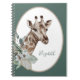 Boho-inspecred notebook featuring watercolors of a girafe in tropical florals and green lotelook leaves. Monogram with your name in a stylish dark green script.