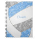 Ce joli carnet à thème volleyball présente l'image réaliste d'un volleyball abstrait surdimensionné qui a des panneaux bleu clair, gris et blanc avec des fleurs de doodle délicates dessinées à la main, des plumes et des paislies sur les panneaux bleu et gris du volleyball - customisez avec le nom de l'athlète - par katz_d_zynes