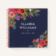 carnet en spirale carré imprimé avec des arrangements de fleurs dessinées à la main en orange, rouge corail, rose chaud et blanc. Ajoutez votre nom et le sujet du carnet en lettres blanches.