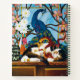 Calico cat jouant avec un dragon chinois rouge devant un vitrail de paon.