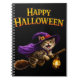 Cast on your notes with this magical tabby witch kitten spiral notebook perfect for journalling schoolwork or jotting down your favourite autumn recipes this notebook features an adorable tabby kitten in a purple which is hat and cape soaring through the night on her broomstick with a glowing lantern set against a deep black background with a bold happy Halloween greeting this high-quality journal combined spooky sweet charm with every day practicality a wonderful gift for a cat lovers writers or students who want to bring a touch of whimsical enchantment to their desk