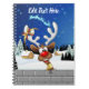 Un joyeux renne de dessin animé avec un nez rouge brillant et de grandes bois blanches, orné d'un nœud rouge et or, regarde par une fenêtre ouverte. À l'extérieur, un paysage enneigé avec des pins silhouettés et une petite maison éclairée est visible sous un ciel nocturne bleu foncé rempli d'étoiles. Le traîneau du Père Noël tiré par des rennes vole au loin. La scène évoque une atmosphère de Noël festive et fantaisiste. Art vectoriel original Copyright BluedarkArt TheChameleonArt.