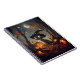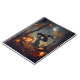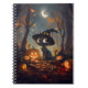 Un chat noir vêtu d'une couleur orange et d'un casquette de sorcière noir est assis sous une lune de croissant dans une forêt d'automne entourée de feuilles et de Jack-o-Lanterns éclatants. Ce carnet mignon est parfait pour célébrer la saison la plus effrayante de l'année - Halloween!