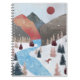 Un magnifique paysage aux textures uniques montrant un paysage de rivière et de montagne avec un renard en chasse à mi-sauts dans la neige dans les tons rouge, vert, bleu et beige.