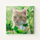Photo d'un chat gingembre aux yeux vert pâle assis dans une longue herbe verte.