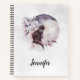 Carnet spirale avec un aquarelle représentant un chat noir et un bouquet floral violet clair et rose. Devant une grande lune. Design et magique.