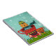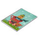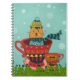 Un carnet en spirale avec l'image d'un adorable chat orange assis dans une tasse. Portant un casquette et une écharpe d'hiver. Les flocons de neige tombent contre un arrière - plan vert clair.