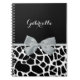 Un cahier d'impression de girafe noir et blanc chic avec un élégant ruban gris argenté attaché à un arc féminin. Personnalisez ce design de poster de animal girly en ajoutant votre nom. Impression plane, pas arc réel.