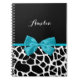 Un bloc-notes design en girafe noir et blanc avec un ruban bleu aqua branché dans un arc de cercle. Personnalisez ce joli dessin animal en ajoutant votre nom. Impression plane, pas arc réel.