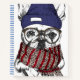 Ce portrait d'un chien d'hiver douillet présente le French Bulldog en tricot foulard, beanie et lunettes