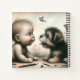 Bébé est face à face avec un chiot Yorkie. Après que leurs yeux se rencontrent, ils sont étrangement fascinés l'un par l'autre. Deux oiseaux en arrière-plan. Parfait pour un cadeau de fête des mères ou un cadeau d'anniversaire pour une nouvelle maman.
